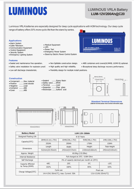 LUMINOUS Baterai telah melewati proses kontrol yang canggih dan sesuai dengan standar global. Tidak hanya mengisi ulang dengan lebih cepat, tetapi juga tahan lebih lama. Memiliki masa pemakaian yang lama dan tingkat discharge yang rendah.